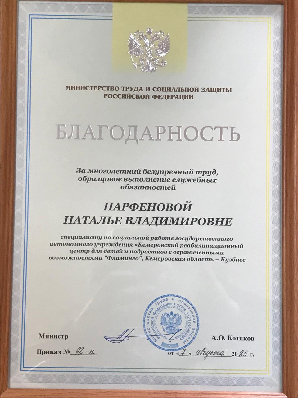 Поздравляем Парфенову Наталью Владимировну, специалиста по социальной работе ГАУ «КРЦ Фламинго» с получением высокой награды: Благодарность Министерства труда и социальной защиты Российской федерации за многолетний безупречный труд, образцовое выполнение должностных обязанностей!